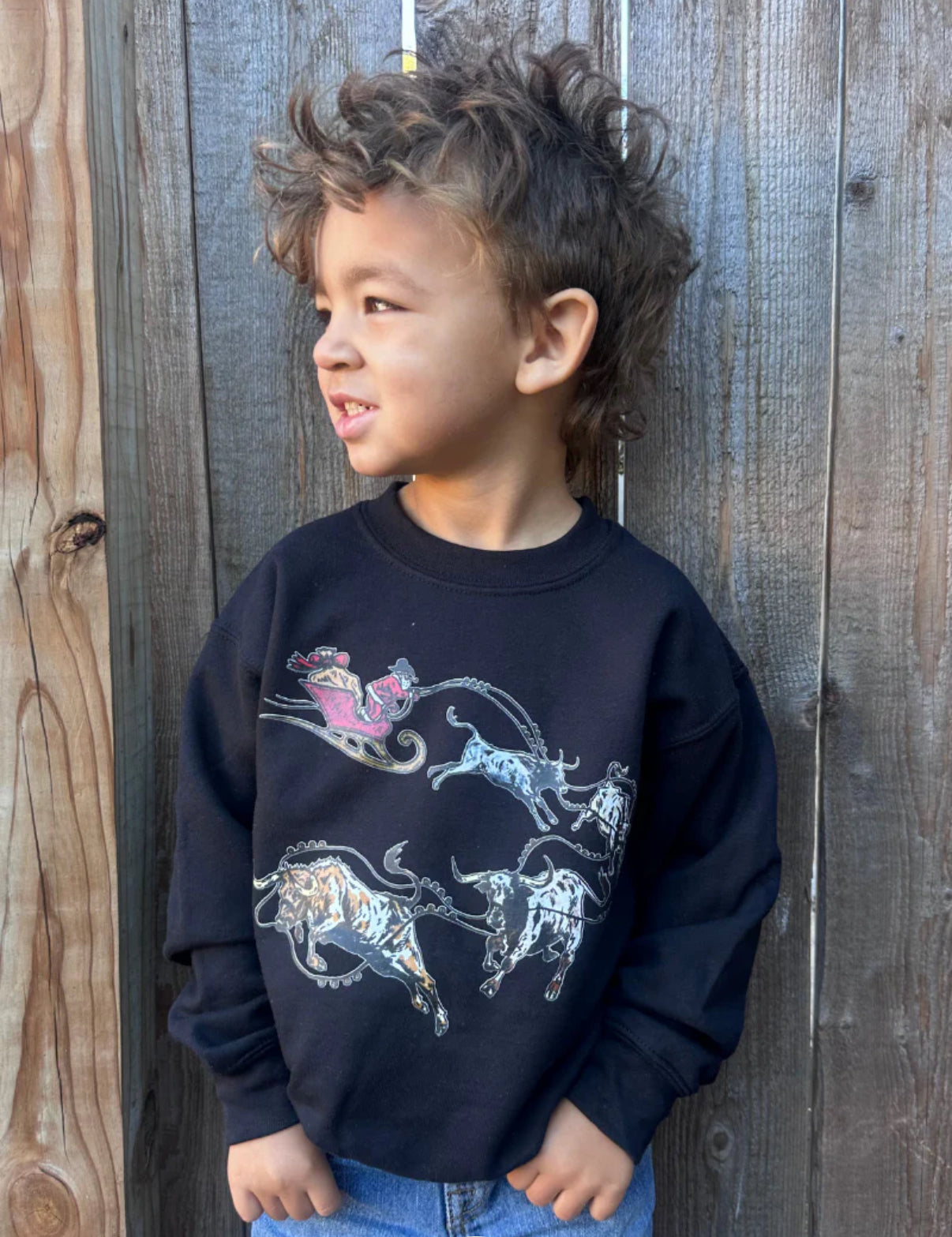 Let your little one sleigh into the season with a twist! This charming pullover features Santa's iconic sleigh pulled by a team of sturdy steers instead of the traditional reindeer—a playful nod to ranch life and holiday spirit combined. Perfect for kids who love cattle country, this cozy piece brings festive cheer with a uniquely Western flair. Soft, comfortable, and conversation-starting, it's the ideal gift for young cowboys and cowgirls ready to make this holiday season unforgettably fun.