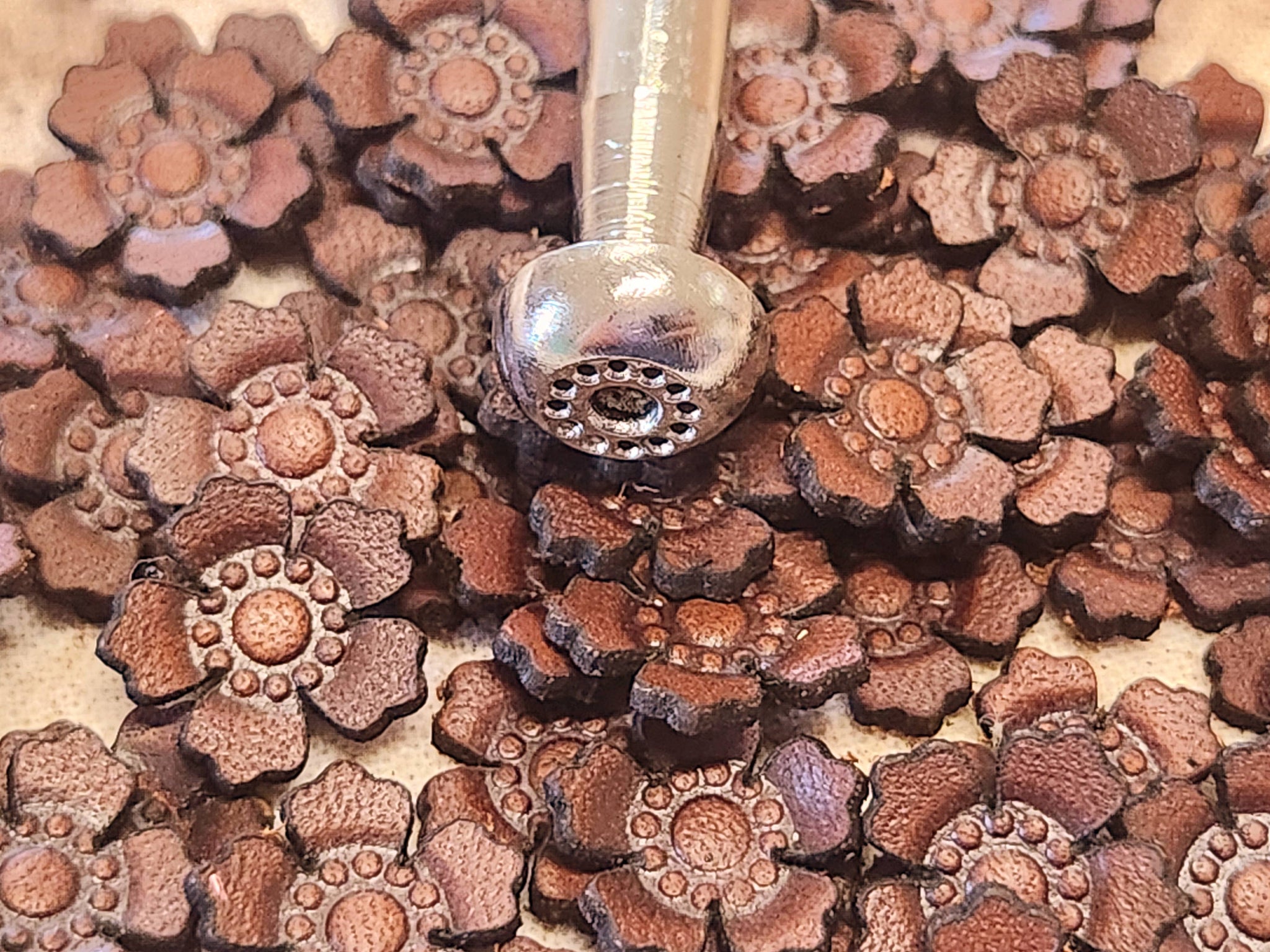 Cute western stud earrings with a vintage western look. Hand stamped and painted on genuine leather. Stainless steel posts.